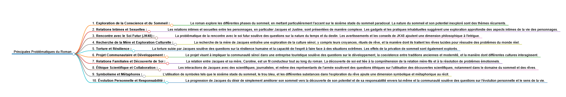ici j'ai posté un mindmap sur les problématiques du roman le sixième sommeil de Bernard Werber à partir d'un résumé que j'ai posté sur chatGPT.