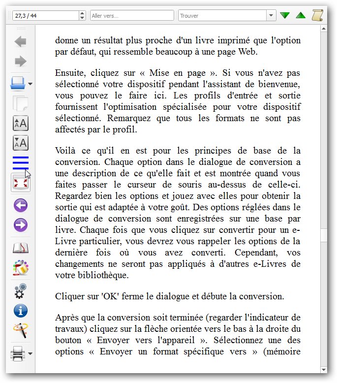 En résumé, calibre vous permettra d'organiser votre bibliothèque, de lire directement les livres qu'elle contient et de les convertir dans la plupart des formats connus pour les lecteurs e-books externes (Android, Kindle, Sony, iPhone...)