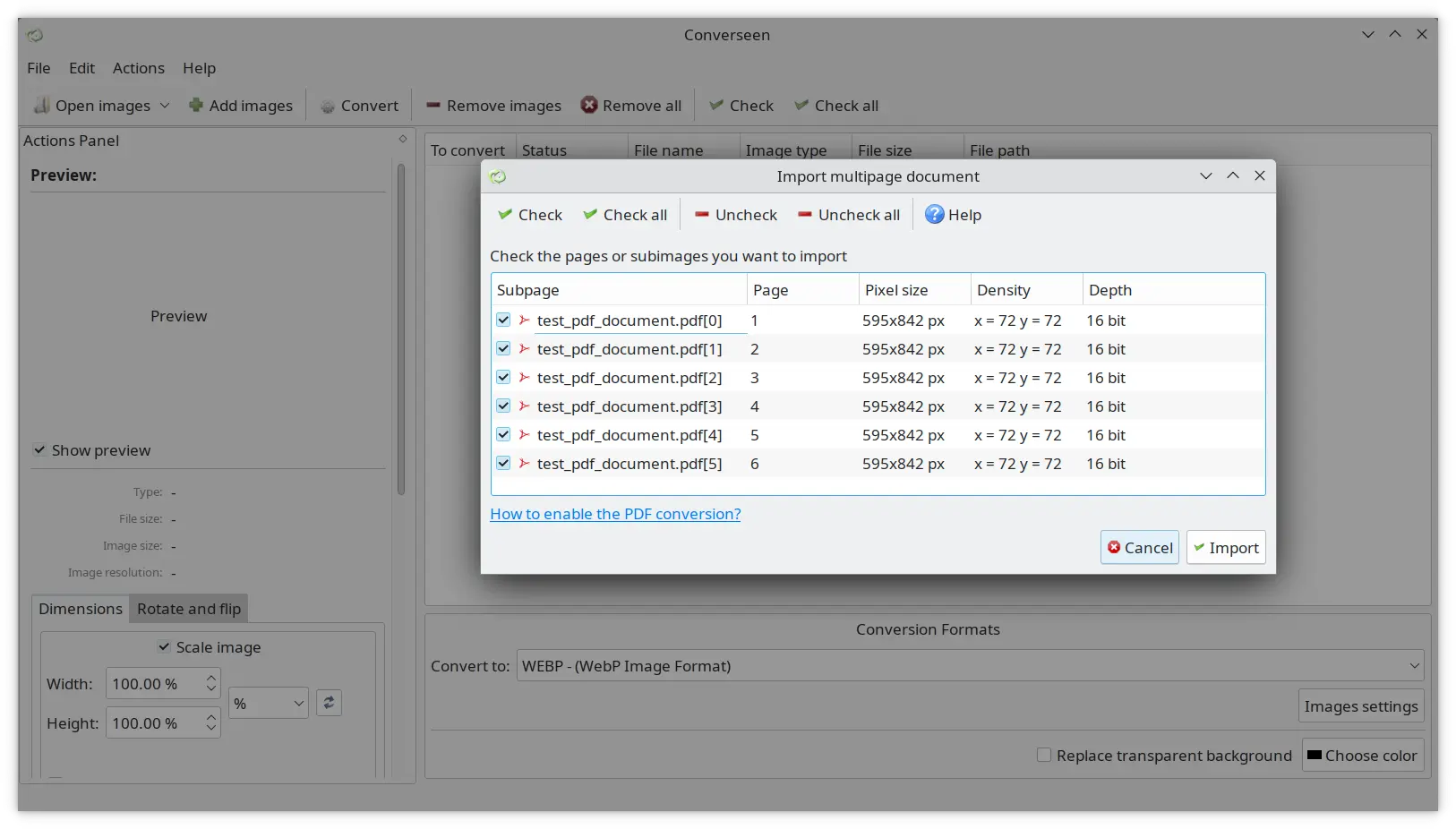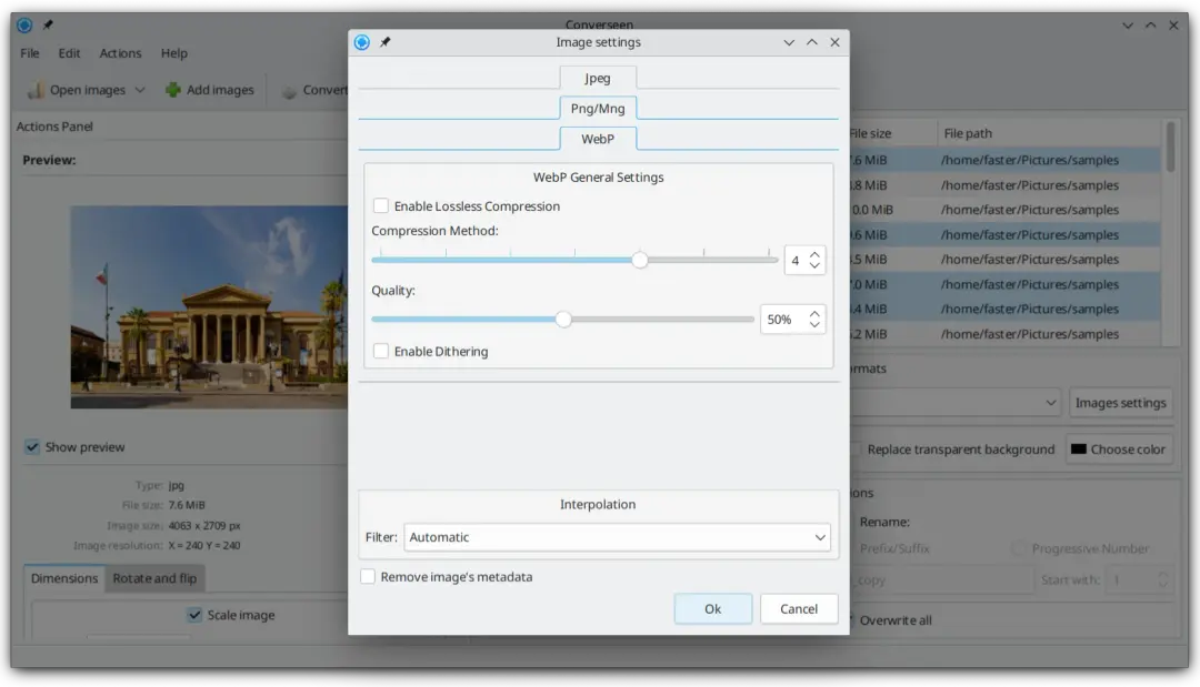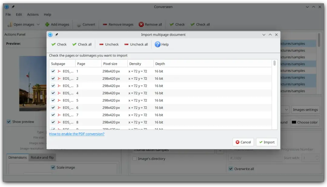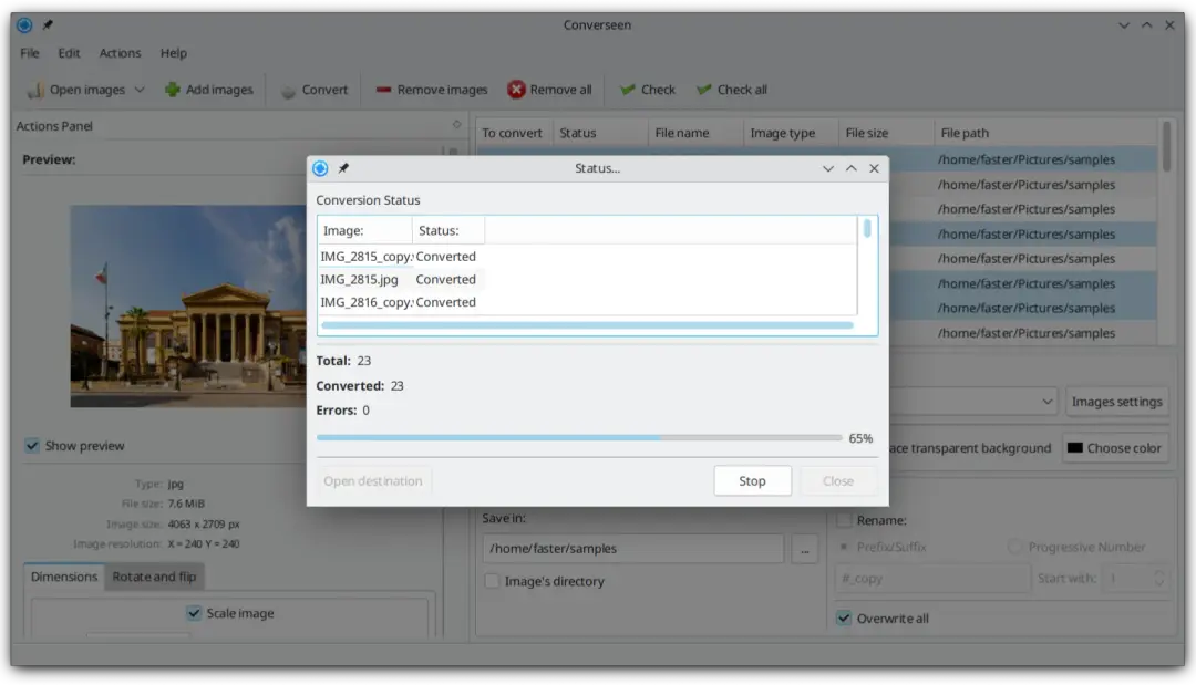 Converseen est un processeur d'images par lots multiplateforme gratuit pour Windows, Linux, macOS, FreeBSD et d'autres systèmes d'exploitation. Il vous permet de convertir, redimensionner, faire pivoter et retourner un nombre infini d'images d'un simple clic de souris. De plus, Converseen peut convertir un document PDF entier en un ensemble d'images avec vos caractéristiques préférées. Vous pouvez choisir parmi plus de 100 formats, définir la taille, la résolution et le nom du fichier.