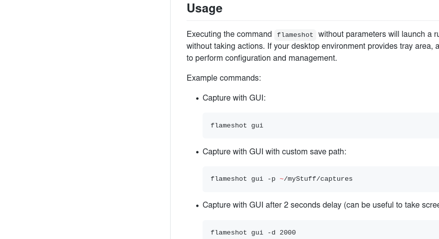 • Interface de ligne de commande (CLI) : Flameshot a plusieurs commandes que vous pouvez utiliser dans le terminal sans lancer l'interface graphique via une interface de ligne de commande.L'interface de ligne de commande vous permet de scripter Flameshot et de l'utiliser comme sujet de liaisons de touches.