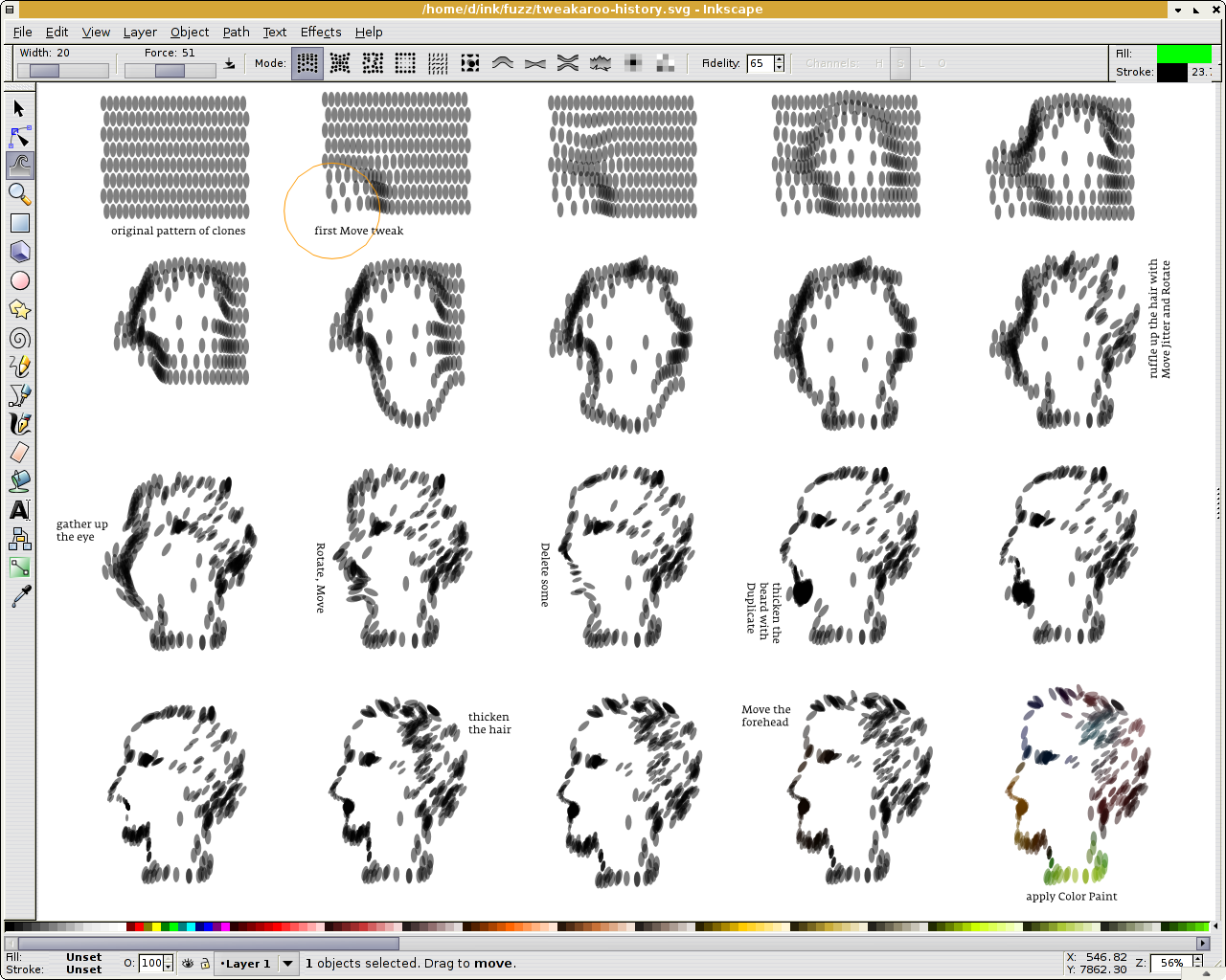 - Clones (copies liées "vivantes" d'objets), y compris un outil permettant de créer des motifs et des arrangements de clones.