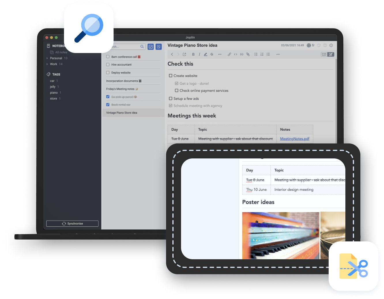 Joplin est "offline first", ce qui signifie que vous avez toujours toutes vos données sur votre téléphone ou votre ordinateur. Cela garantit que vos notes sont toujours accessibles, que vous disposiez ou non d'une connexion internet.