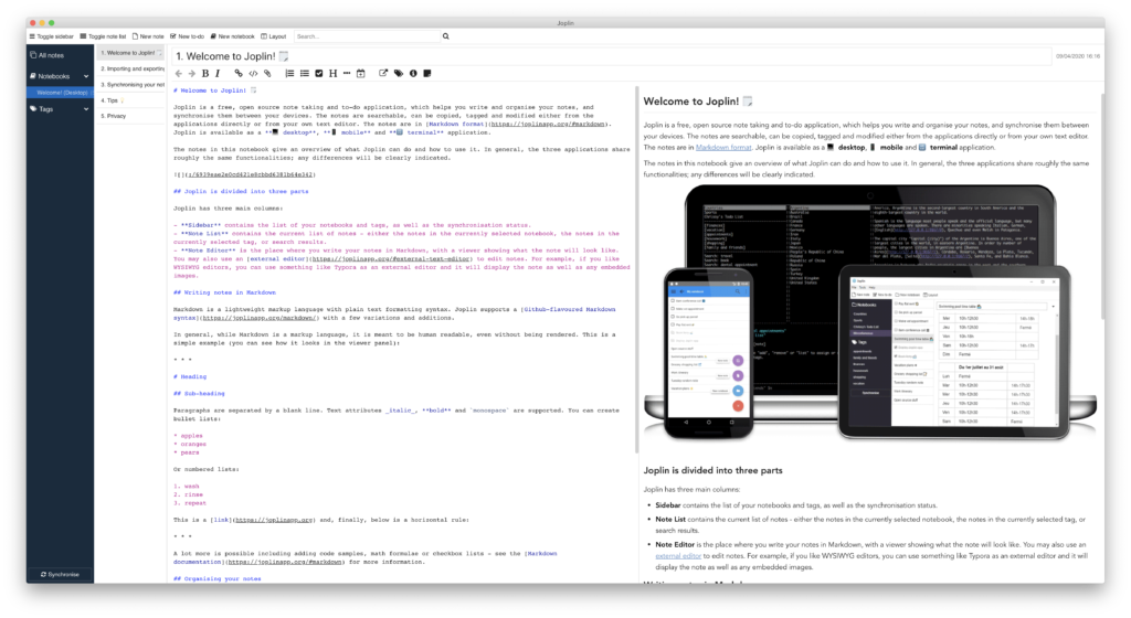Joplin est une application libre et gratuite de prise de notes et de tâches à faire (rien à voir avec la célèbre chanteuse), qui peut gérer un grand nombre de notes organisées en carnets. Les notes sont consultables, peuvent être copiées, étiquetées et modifiées soit directement à partir de l'application, soit à partir de votre propre éditeur de texte. Les notes sont au format Markdown.