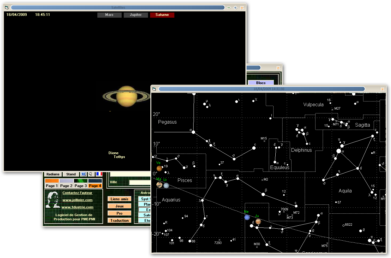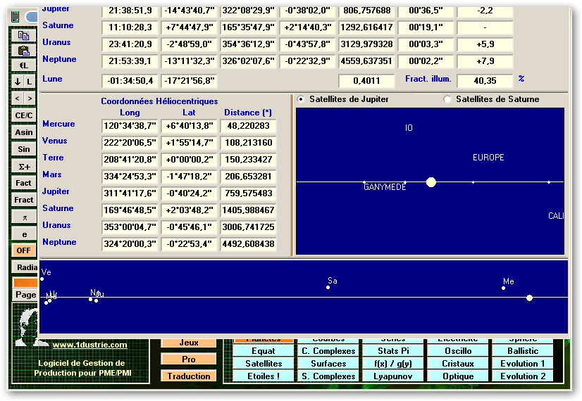Astronomie : Coordonnées planétaires géocentriques et héliocentriques. Simulation 3D du Système Solaire. Calcul des positions des satellites de Mars, Jupiter et Saturne, avec animations. Ballade dans les étoiles. Projection des planètes sur l'Equateur céleste.