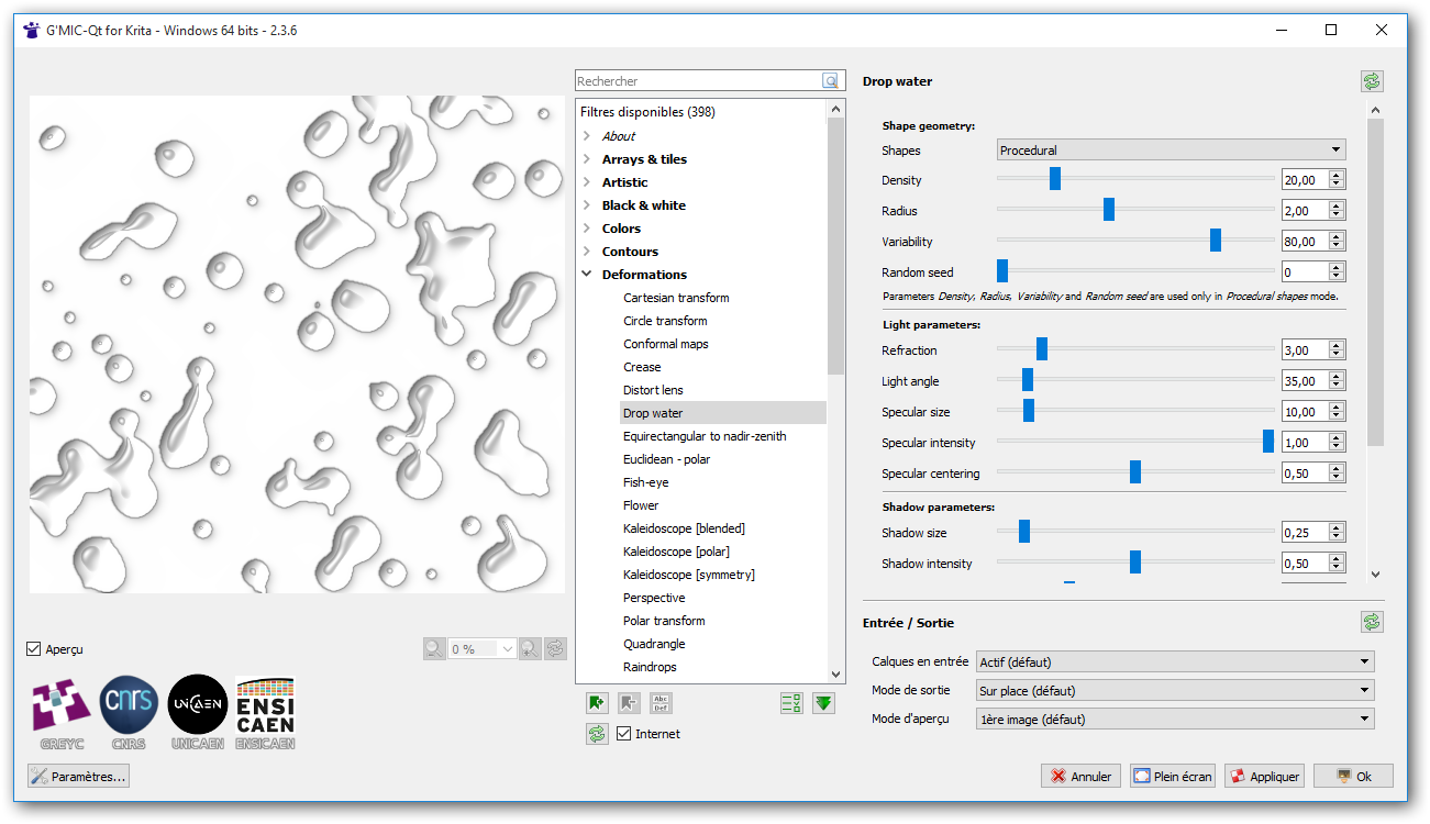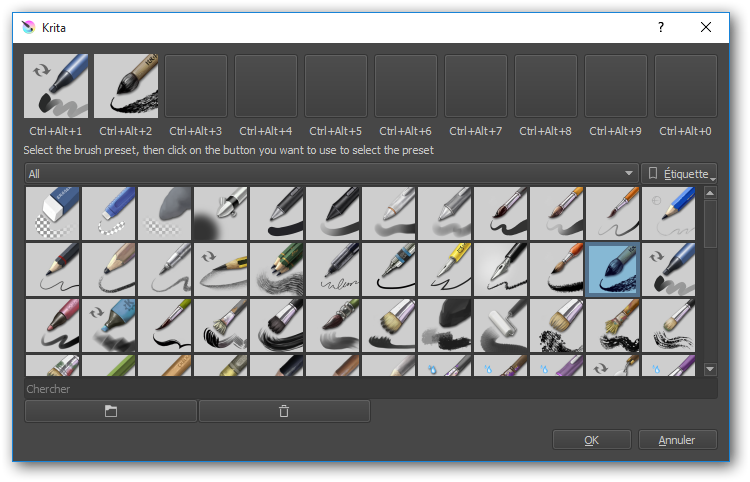 • Moteurs pour Brosse : Personnalisez vos brosses avec neuf moteurs de brosse uniques. Chaque moteur a une large quantité de paramètres pour personnaliser votre brosse. Chaque moteur de brosse est conçu pour satisfaire un besoin spécifique tel que le moteur Color Smudge (tâche de couleur), Shape (forme), Particle (particule) et même un moteur de filtre. Une fois la création de vos pinceaux terminées, vous pouvez les sauvegarder et les organiser grâce au système de marquage unique de Krita.