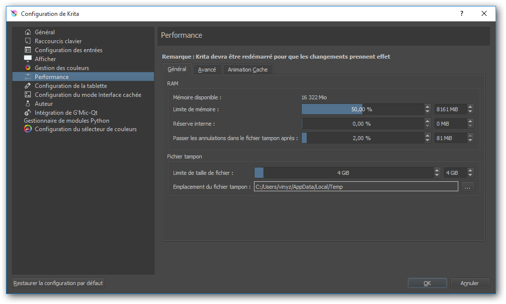 • Amélioration OpenGL : Krita tire parti de l’API OpenGL pour certaines de ses opérations. Avec OpenGL activé, vous observerez par exemple une mise en rotation de votre espace de travail ainsi que le zoom gagner en vitesse. La qualité visuelle sur votre espace de travail sera également meilleure.