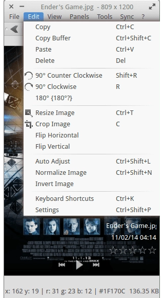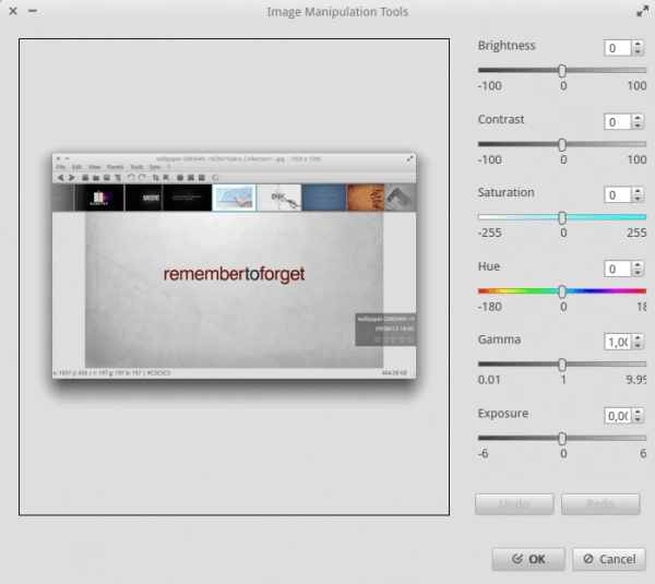 - nomacs comprend des méthodes de manipulation d'images permettant d'ajuster la luminosité, le contraste, la saturation, la teinte, le gamma et l'exposition.