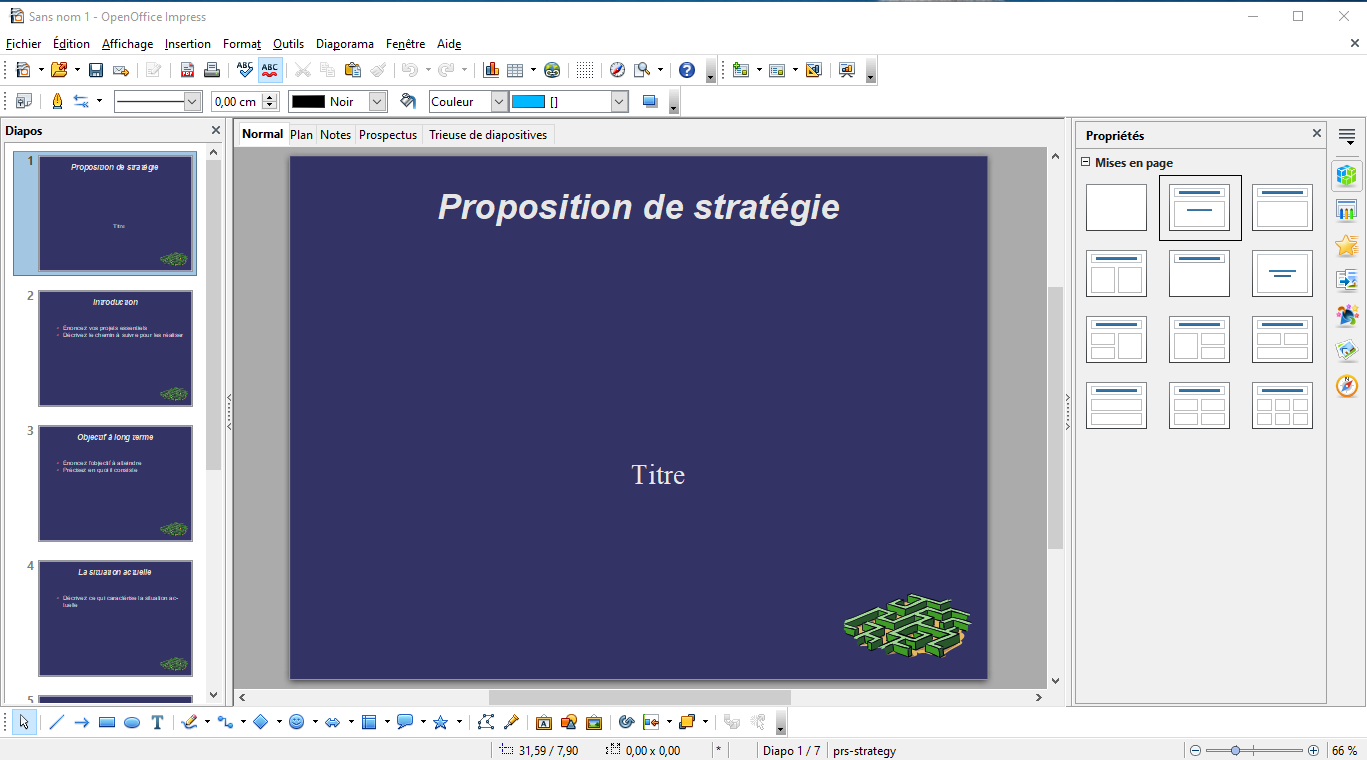 • Impress, le module de présentation équivalent de MS-Powerpoint. Permet de composer des présentations sous forme de suites de diapositives. Celles-ci visent à mettre en valeur visuellement les points importants d’un exposé oral.