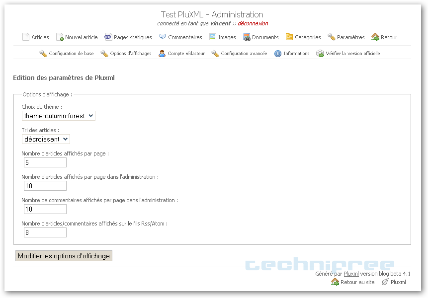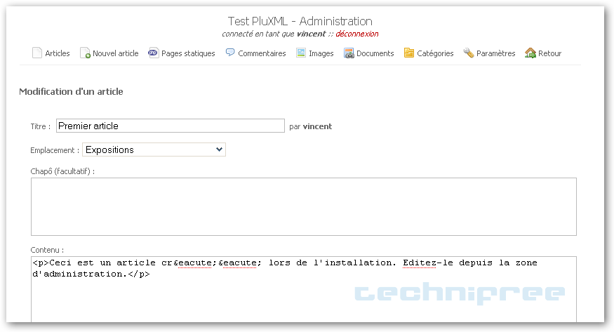 PluXml est un outil particulièrement léger et simple d'utilisation. Pour l'installer il vous suffit de décompresser son archive de petite taille sur votre espace web et lui indiquer votre nom et mot de passe.