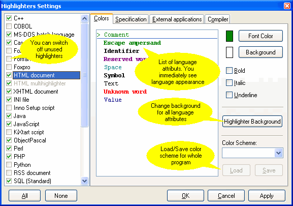 • export avec coloration syntaxique vers les formats RTF, HTML, TeX ou le presse papier