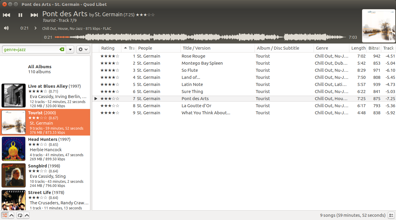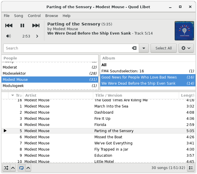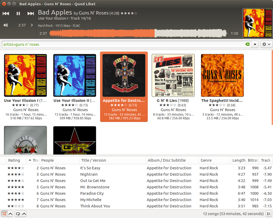 Contrairement à d'autres logiciels de ce type, Quod Libet s'adapte à des bibliothèques de plusieurs dizaines de milliers de chansons. Il prend également en charge la plupart des fonctionnalités que vous attendez d'un lecteur multimédia moderne : Prise en charge de l'Unicode, édition avancée des balises, Replay Gain, podcasts et radio Internet, prise en charge des pochettes d'album et tous les principaux formats audio (voir les captures d'écran).