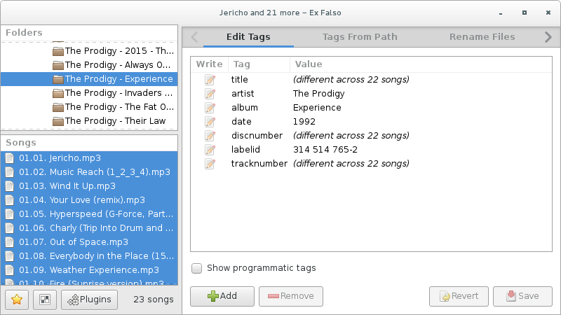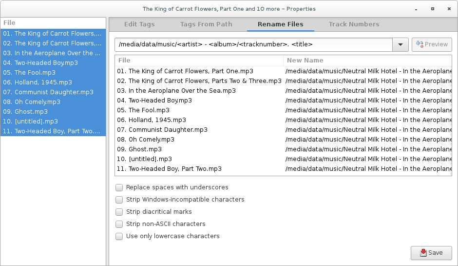 • Renommer les fichiers en fonction de leurs balises, avec divers filtres pour les caractères gênants (en particulier sous Windows).
