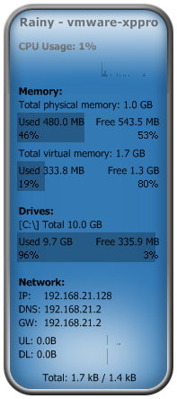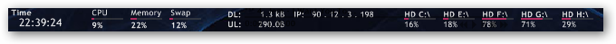 Rainmeter permet en outre d'afficher des informations comme l'horloge, l'activité CPU, mémoire et cache disque (Swap), l'activité réseau (UP / DOWN), l'adresse IP de la machine telle qu'elle est vue sur le net et non pas sur le réseau local (intéressant), les différentes tailles de vos disques locaux et réseaux, etc.