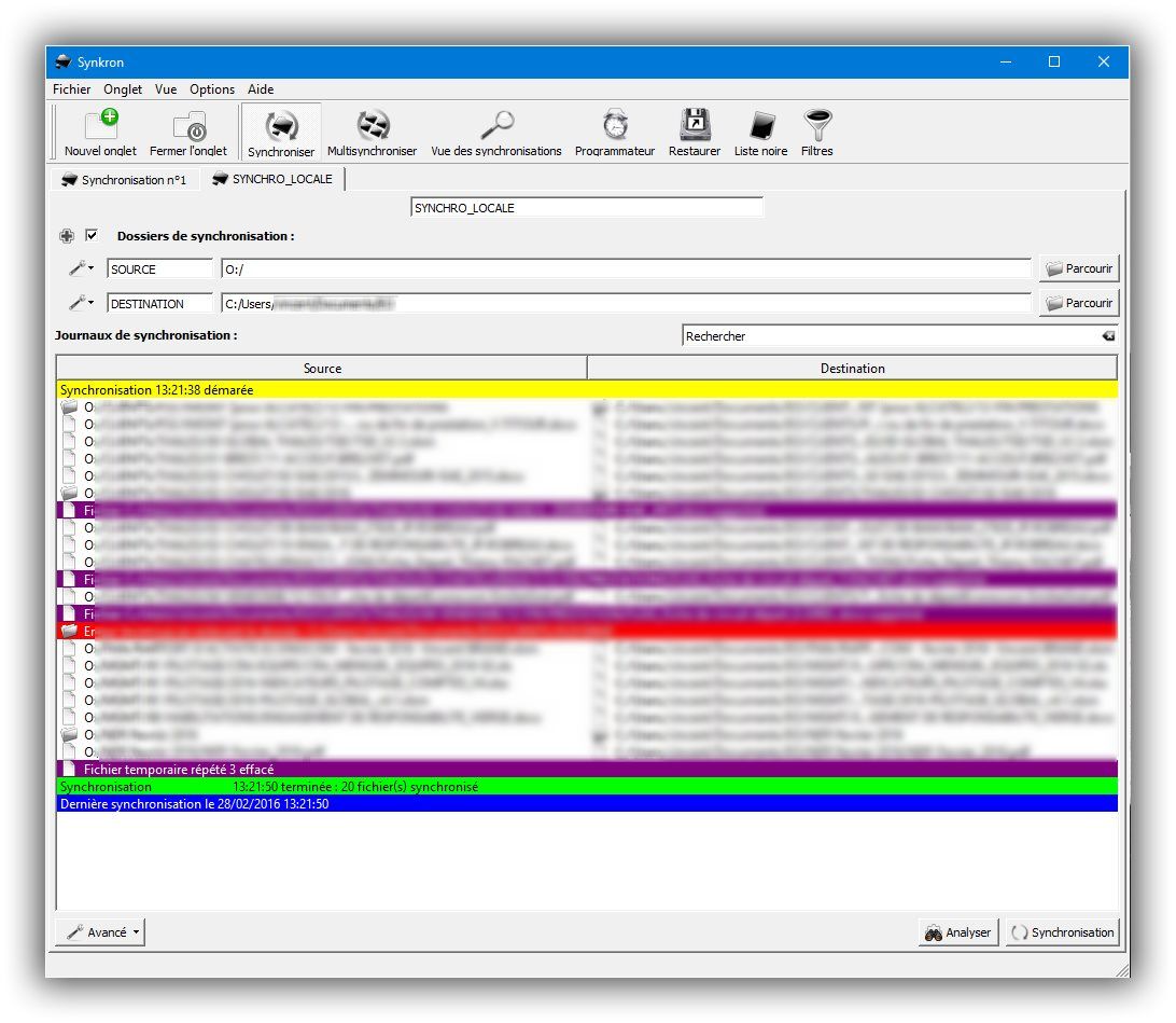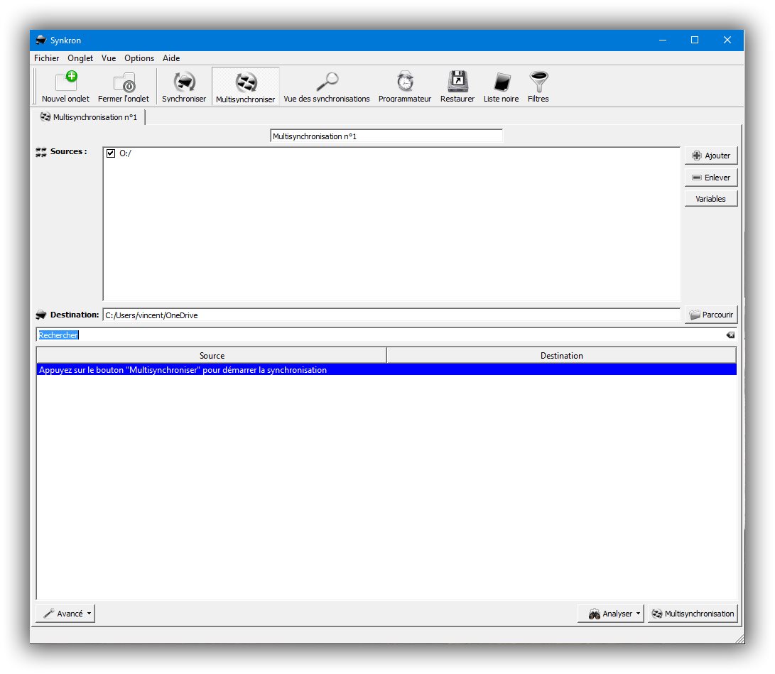 L'application affiche les différentes synchronisations sous forme d'onglets (CTRL + W pour fermer ceux-ci), il est possible de synchroniser toutes les sources avec toutes les cibles en une seule opération. Il est également possible de planifier des synchronisations.
