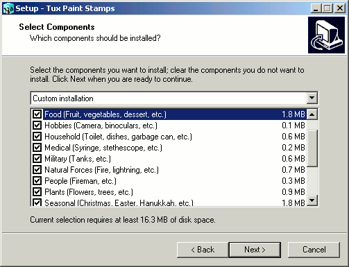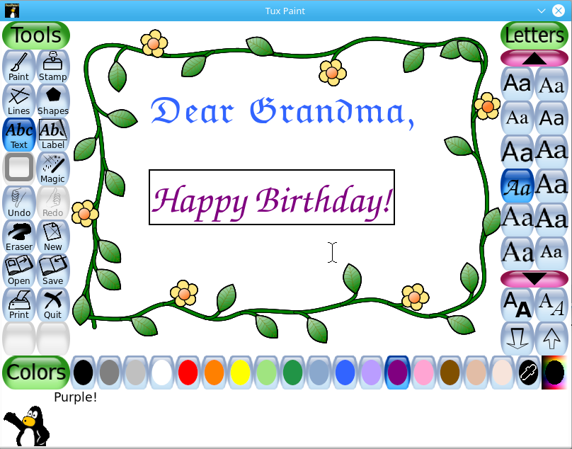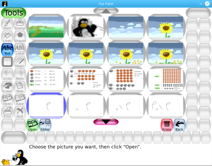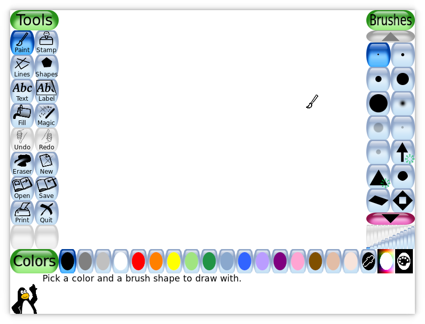 • Tampons : Tux Paint inclut une vaste bibliothèque de tampons, qui sont des images prédéfinies que les utilisateurs peuvent ajouter à leurs créations. Cela stimule l’imagination et rend le processus de création encore plus amusant.