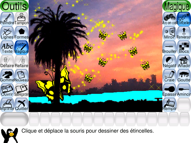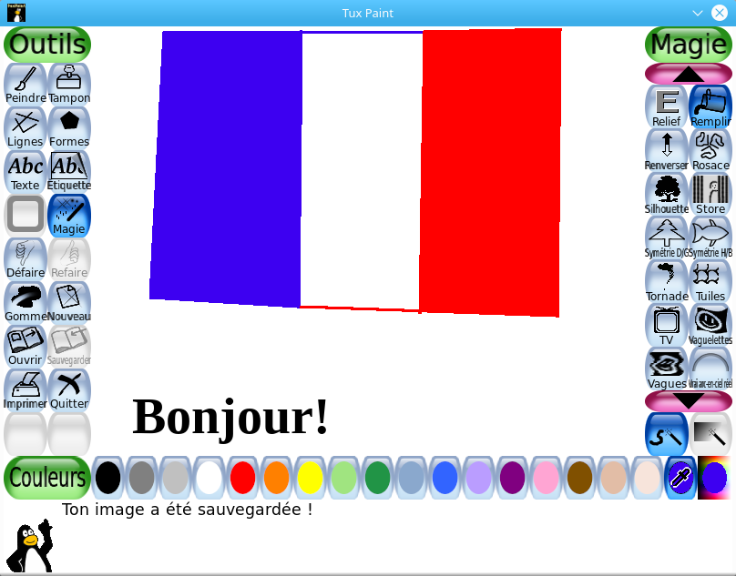 • Sons et Animations : À chaque action, Tux Paint émet des sons amusants et des animations, rendant l'expérience encore plus engageante et ludique.