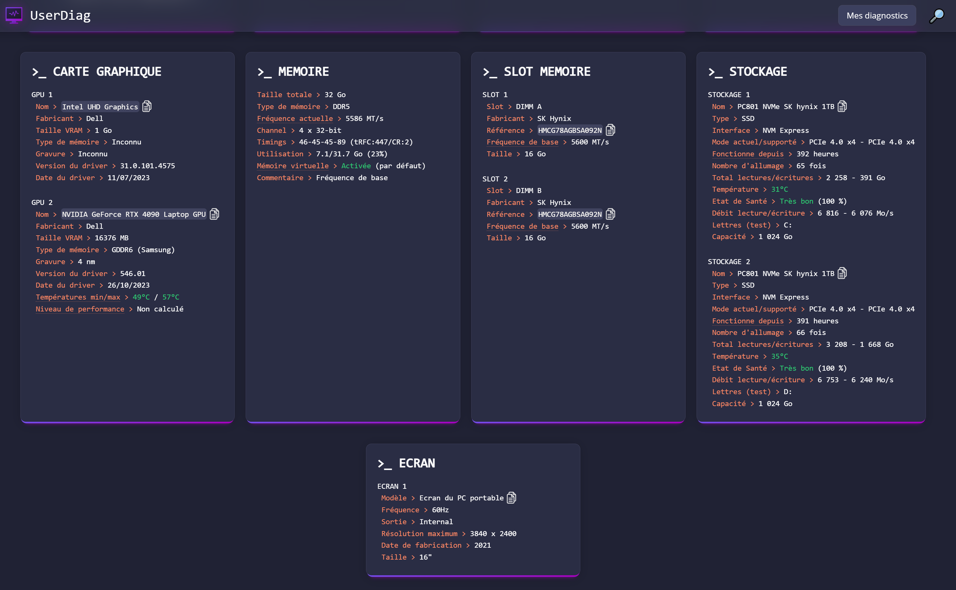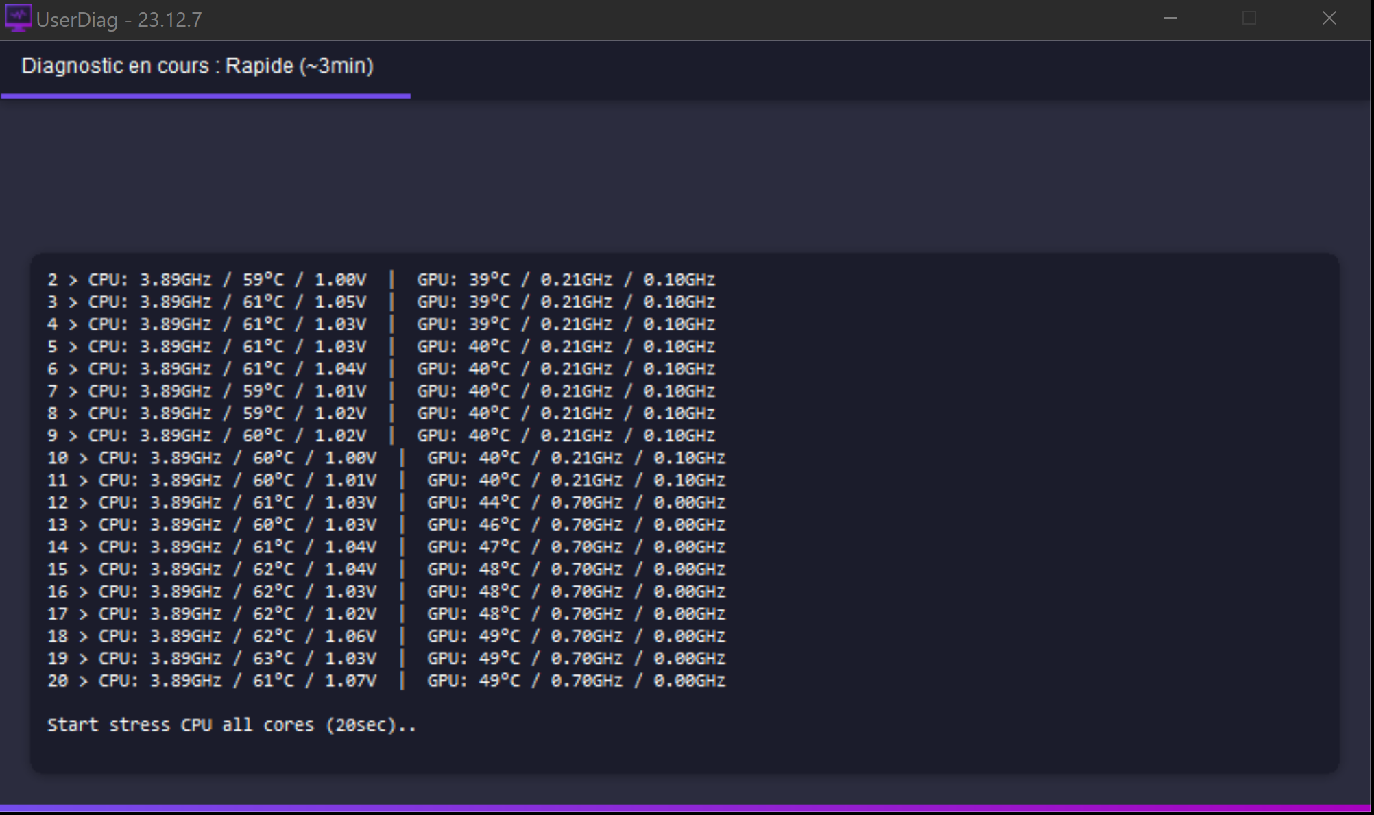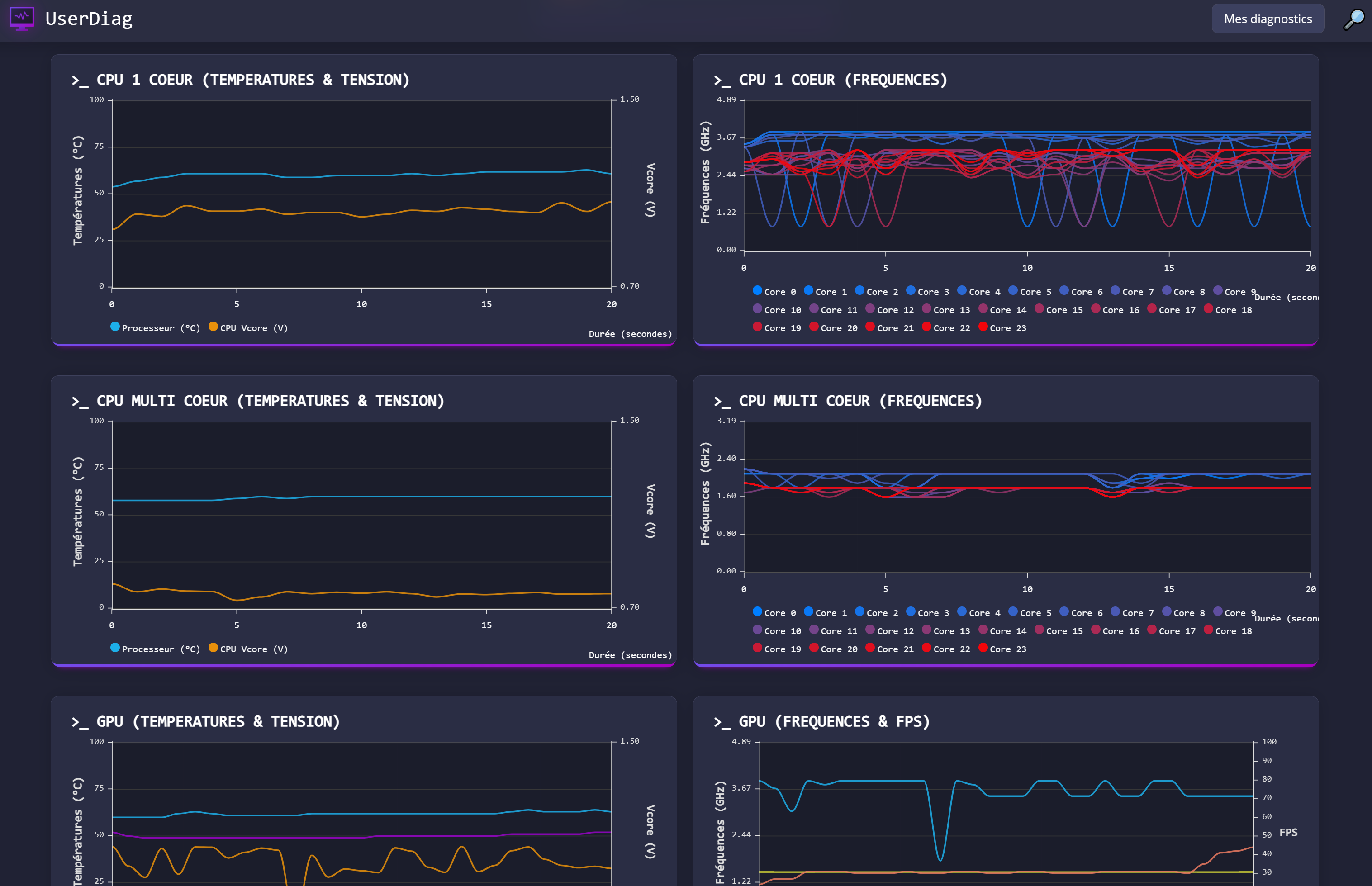 Les informations concernant votre bios, Windows, ainsi que les composants de l'ordinateur seront alors récupérées. Durant la détection et le stress de vos composants, plusieurs valeurs seront récupérées par UserDiag, comme la température, les fréquences du processeur, RAM, et de la carte graphique. Cela vous permettra de vérifier que tout fonctionne de façon optimale. Enfin, à la fin du test, UserDiag ouvrira dans votre navigateur votre diagnostic. Il ne vous restera plus qu'à vérifier que tout est parfait !