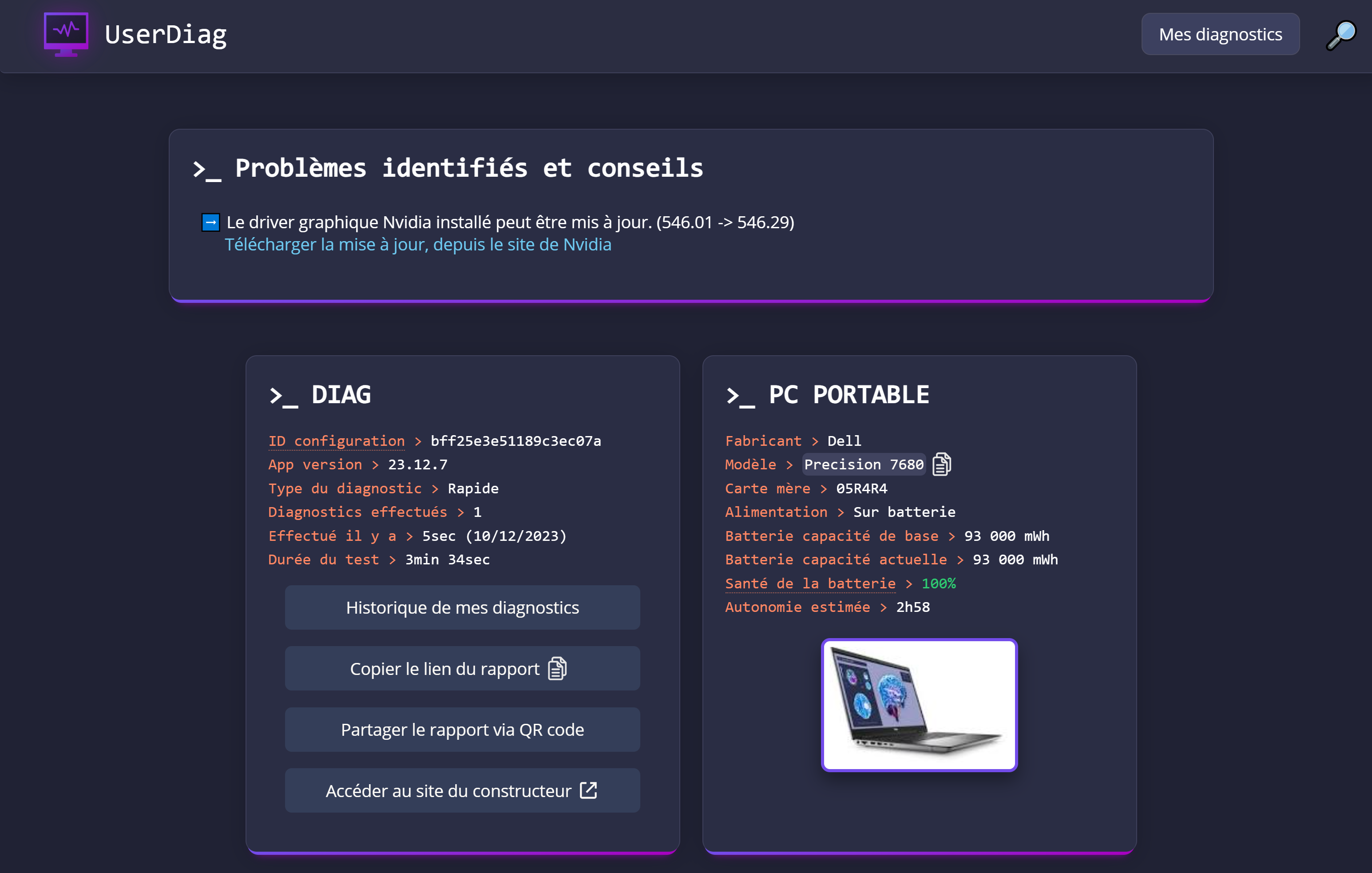 UserDiag est un outil de diagnostic qui permet de récupérer les caractéristiques matérielles de votre ordinateur, tout en réalisant différents tests afin de s'assurer du bon fonctionnement de vos composants.