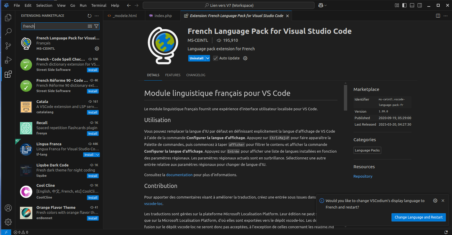 • Gestionnaire d’extensions pour ajouter des outils, thèmes, snippets, langages, etc.