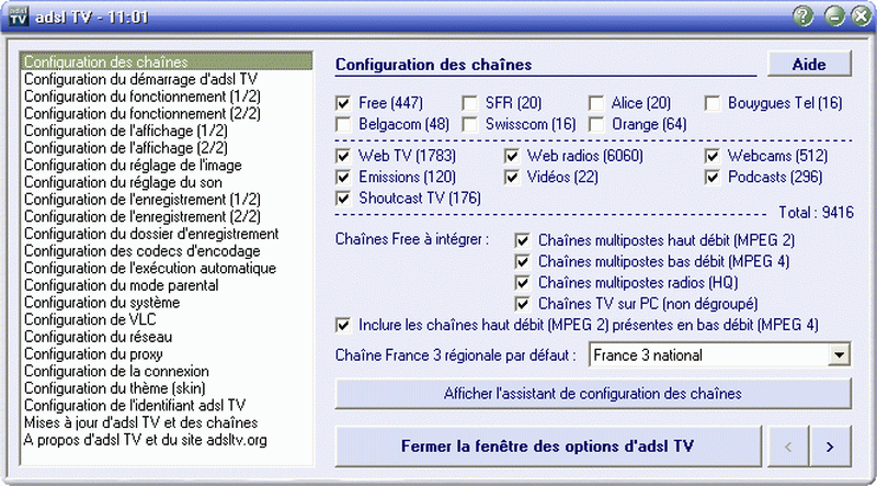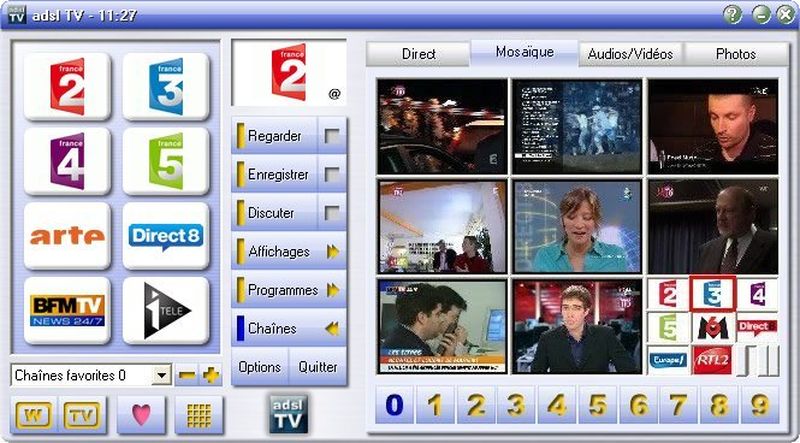 Avec adsl TV/FM, vous accédez aux télévisions et radios en ligne : Free, SFR (Neuf, Club Internet, AOL, Télé2), Orange, Alice, Bouygues Telecom, web TV, web radios, webcams, vidéos, émissions (JT de TF1, France 2, France 3, M6, météo, ...), podcasts, ... déjà 9.000 chaînes accessibles d'un clic.