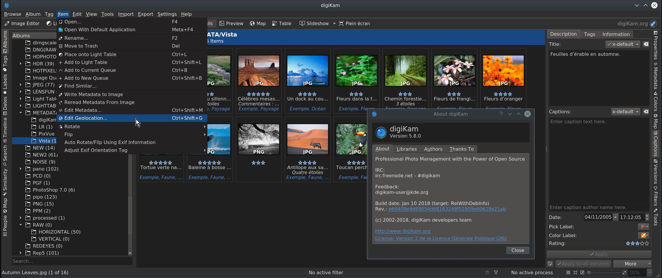 digiKam est une application open-source avancée de gestion de photos numériques qui fonctionne sous Linux, Windows et macOS. L'application fournit un ensemble complet d'outils pour l'importation, la gestion, l'édition et le partage de photos et de fichiers bruts.