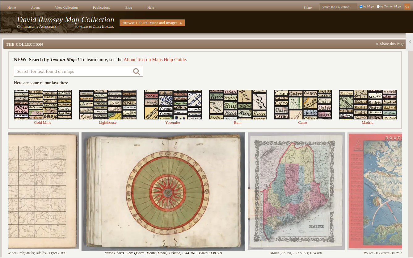 La collection de cartes historiques David Rumsey se concentre sur les cartes du XVIe au XXIe siècle de l'Amérique du Nord et du Sud, ainsi que sur les cartes du monde, de l'Asie, de l'Afrique, de l'Europe et de l'Océanie. La collection comprend des atlas, des globes, des géographies scolaires, des cartes maritimes et une variété de cartes séparées, notamment des cartes de poche, des cartes murales, des cartes pour enfants et des cartes manuscrites. La sélection en ligne est une section transversale d'images conçue pour mettre en évidence la profondeur et l'étendue de la collection. Les images numériques et les données descriptives associées sont protégées par le droit d'auteur de Cartography Associates. La collection de cartes physiques est conservée au David Rumsey Map Center de l'université de Stanford.