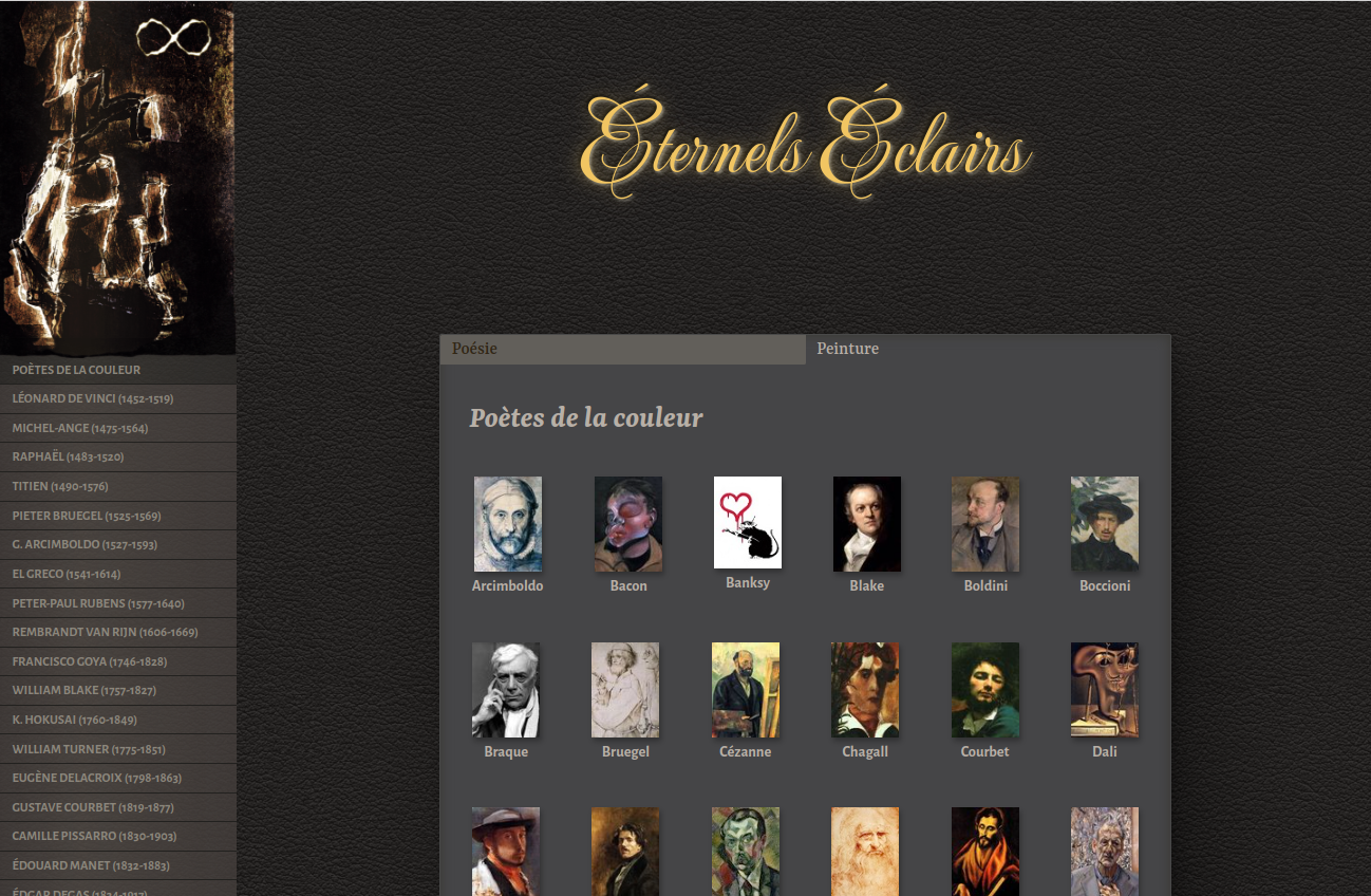 🇲🇫 Voici un site qui vous fera voyager à travers l'art, presque un musée en soi qui vous présente un grand nombre d'artistes peintres ainsi que leur principales oeuvres. Vous trouverez également les nombreux poèmes de Stéphen Moysan, l'auteur du site. A visiter pour (re)découvrir la biographie et les oeuvres des principaux peintres (ils n'y sont pas tous, mais la liste est déjà très conséquente).