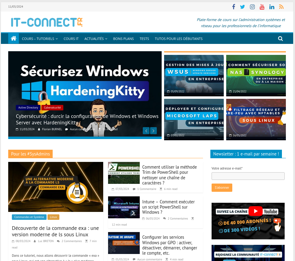 🇲🇫 IT-Connect.fr est une plateforme riche en ressources pour les professionnels IT, couvrant un large éventail de sujets techniques. Elle propose des tutoriels détaillés, des cours, et des actualités sur des thèmes comme l'administration système sous Windows et Linux, la virtualisation, les serveurs web, et la cybersécurité. Le site est conçu pour aider les techniciens, administrateurs système, et amateurs d'informatique à approfondir leurs connaissances techniques et à rester à jour avec les dernières tendances et outils du domaine