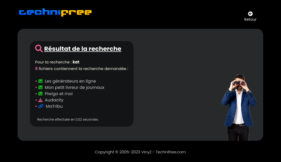 RE: Avancement du site - vincent - 22-12-2023 22/12/2023 Et voilà, toutes les fiches ont été mises à jour concernant leur catégories d'appartenance. Zé fini ![]() (tout ça pour 4 membres ... suis un fou !) Je n'ai plus qu'à m'attaquer à la feuille de route (les fameuses fiches logicielles qui ne sont pas encore sur le site). RE: Avancement du site - Katryne - 22-12-2023 4 membres et tous les autres passionnés trop timides pour s'identifier. RE: Avancement du site - vincent - 22-12-2023 ou les haters : https://forum.chatons.org/t/technifree-logiciels-libres-et-open-source/5438 Rien qu'à lire les remarques, on est encore à l'époque des dinosaures là ! J'avais préparé une réponse pour ce fil de discussion, mais je n'ai pas posté. Ce sera toujours ceux qui ne font rien qui critiqueront ! RE: Avancement du site - Katryne - 22-12-2023 T'as quand même posté. Et sur un ton bien plus posé que les agressions semées tout au long du fil. RE: Avancement du site - vincent - 22-12-2023 Ben je suis fatigué depuis toutes ces années du combat utopique que mènent certains concernant les logiciels libres. Souvent, ces personnes oublient qu'on a aussi des factures à payer et qu'on n'est pas forcé de payer à chaque fois une redevance pour l'utilisation d'un logiciel. Si le développeur le propose au public, c'est d'abord pour l'utiliser avant d'aller chercher ce qui ne va pas dans le code ou de payer forcément une contribution. Celui qui peut, il le fait, celui qui ne peut pas, bah ... il ne le fait pas. Je n'ai lu nulle part dans les différentes licences qu'il faut impérativement participer ! Mais la critique positive, je prends car ça permet d'avancer. RE: Avancement du site - Katryne - 22-12-2023 Et puis dans le nom de Technifree, ya Free et en anglais, cela recouvre les deux acceptations de Libre et de Gratuit. RE: Avancement du site - Sandokan Damaio - 22-12-2023 Je comprends ce que tu as du subir, je m'excuse pour eux, je crois que je n'aurais pas du leur en parler. RE: Avancement du site - vincent - 23-12-2023 Aucun souci, tkt, certaines critiques sont constructives ![]() RE: Avancement du site - vincent - 24-12-2023 24/12/2023 Eh bé ce soir c'est Nowell, enfin ... le réveillon, on va encore prendre du poids comme chaque année et pleurer au nouvel an avec de bonnes résolution ! M'enfin (comme disait Gaston), je me suis quand même fait un dernier cadeau (pour vous aussi, hein, je n'vous oublie pas), j'ai terminé mes petites corrections diverses et avariées (oui, j'en ai mal au crâne à force de peaufiner tout ce code). J'ai donc apporté la dernière petite touche, et pas des moindres, en modifiant un peu le formulaire de recherche du site. Comme vous avez peut être pu le constater, on a une petite loupe qui clignote (comme mon sapin) sur la page principale pour faire une recherche sur tout le site. Maintenant (roulement de tambour, tzoin tzoin), vous pouvez enfin différencier dans les résultats ce qui correspond aux téléchargement, aux articles et aux liens web (couleurs de chaque rubrique incluse tout en tenant compte du thème choisi). Voici le résultat (pour une recherche "Kat") : Allez, Noyeux Jowell à vous tous ![]() RE: Avancement du site - vincent - 26-12-2023 26/12/2023 Les mises à jour des fiches sont assez rapides, quelques minutes suffisent. Cependant, je ne vérifie pas tous les jours chacune d'entre-elles, ce serait une folie. De ce fait, lorsque vous visitez une fiche logicielle qui n'est plus à jour (changement de version, lien qui ne fonctionne plus, etc.), vous avez à présent la possibilité de déclarer un lien mort sur les pages : Ce bouton est valable pour les fiches des logiciels, mais aussi pour les liens web. Une bonne nouvelle n'arrivant jamais seule, ayant mis en place pour la partie des téléchargements la possibilité de naviguer dans les catégories, j'ai donc généralisé également cette fonctionnalité sur la rubrique liens web : |