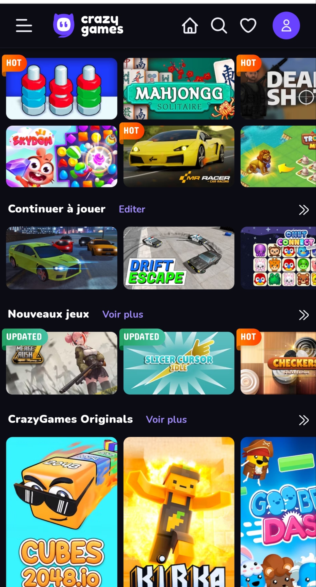 Je viens de trouver ce site Crazy Games plein de jeux en ligne on y trouve des classiques et des nouveautés, jeux très réalistes avec un bon rendu surtout pour certains jeux de voitures, certains jeux demandent une inscription pour conserver votre score et continuer ultérieurement , j en ai testé plusieurs sur mon smartphone, amusez vous pour les grands et les petits