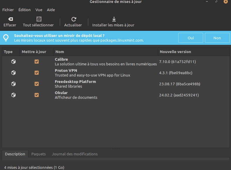 J'ai de nouveau lancé les mises à jour proposées, sauf pour Calibbre, et même problème, Calibre ne se lance plus.
