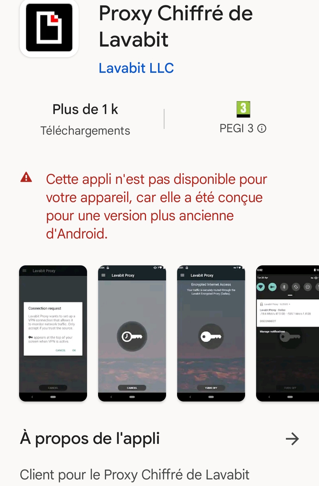 Salut Sandokan à propos de Lavabit que je viens d aller voir sur le play store , fonctionne apparemment sur des versions anciennes Android, moi j ai un Xiaomi 10 Android 13 et donc trop récent