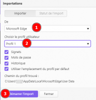 Dans l'outil d'import qui apparaît, choisis le type de navigateur où se trouvent tes favoris (1 - choisis Edge) ainsi que le profil utilisateur concerné (2), tu coches toute les options proposées (Signets, Mots de passe, etc.) c'est plus pratique et tu cliques sur le bouton "Démarrer l'import" (3)